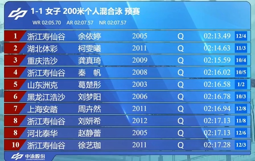 2025全国游泳锦标赛在成都揭开战幕:在刚刚结束的女子200米个人混合泳预赛里,浙江名将余依婷以2分13秒49排在第一;湖北新秀柯雯曦爆冷以2分14秒63排在第二。